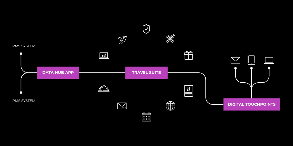 Diese Datenstrukturen werden dann automatisiert in unsere einzeln zubuchbaren Hotelsoftware Apps innerhalb der Travel Suite übertragen. Sie werden zur Grundlage für personalisierte Inhalte, gezielte Services und automatisierte Prozesse, die Ihre Gäste genau dann erhalten, wenn sie relevant sind.
